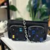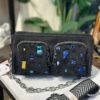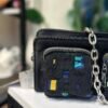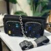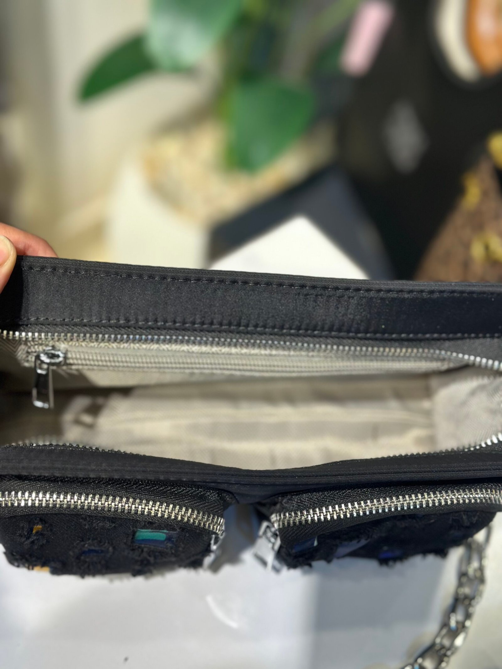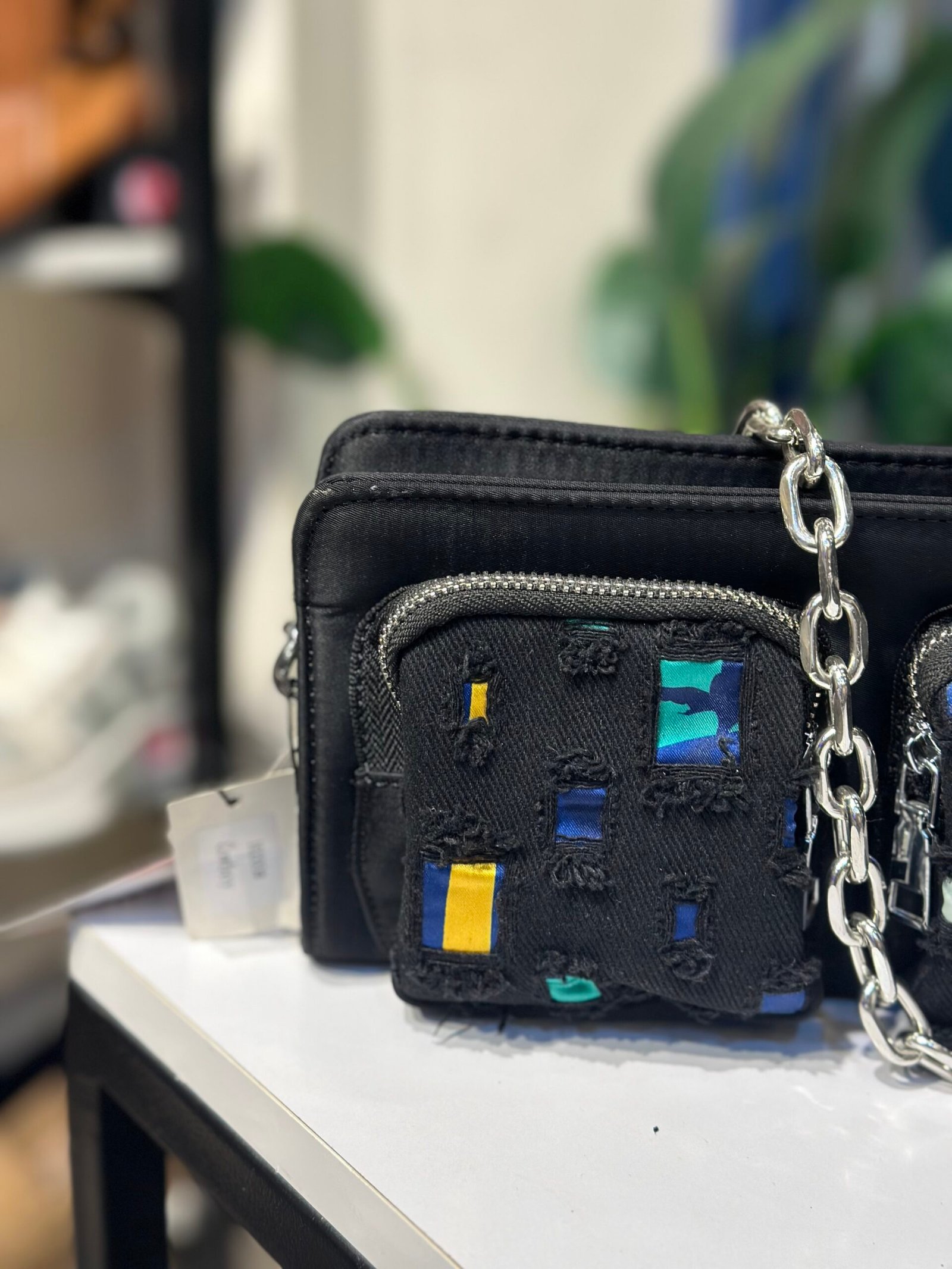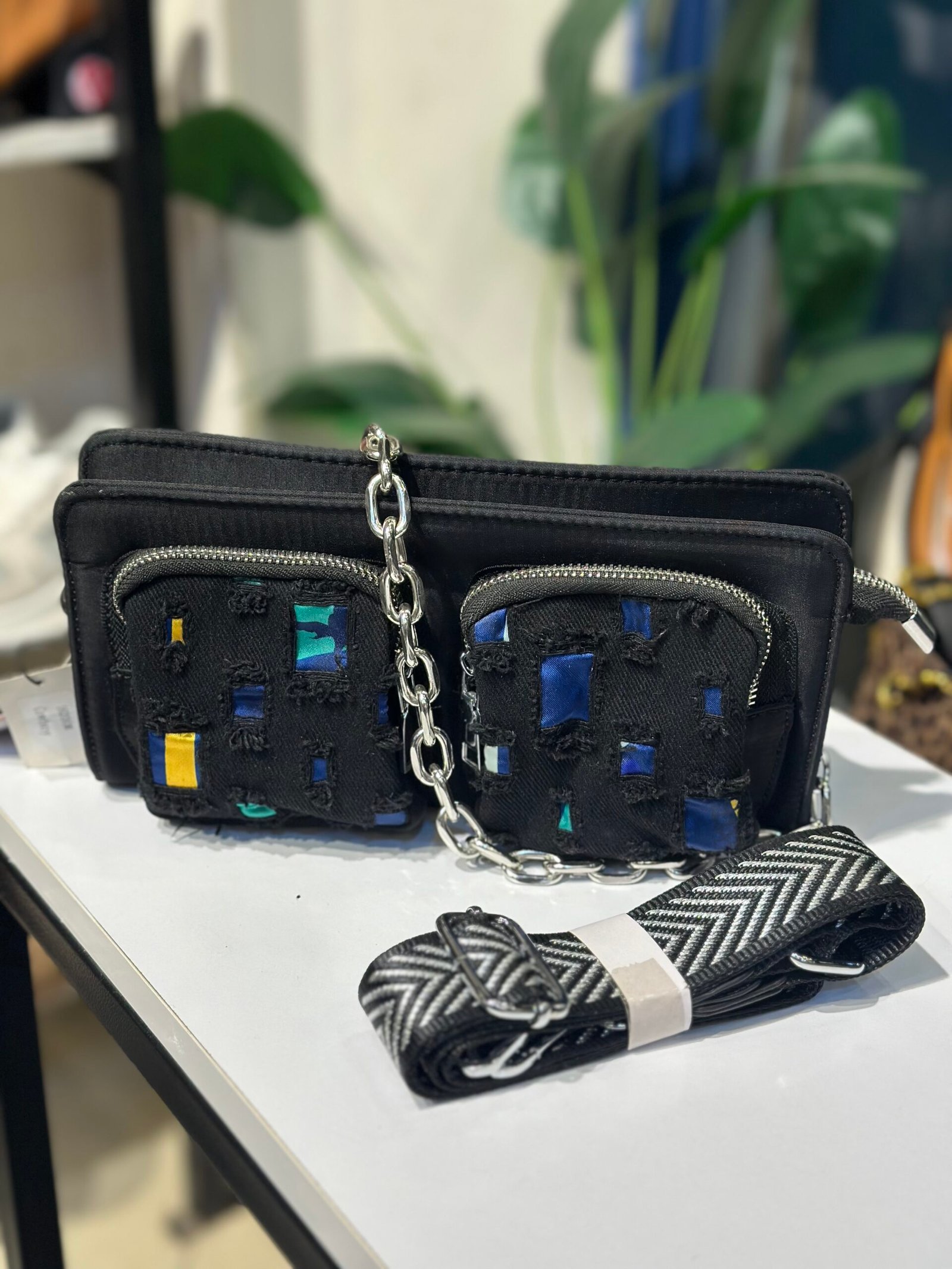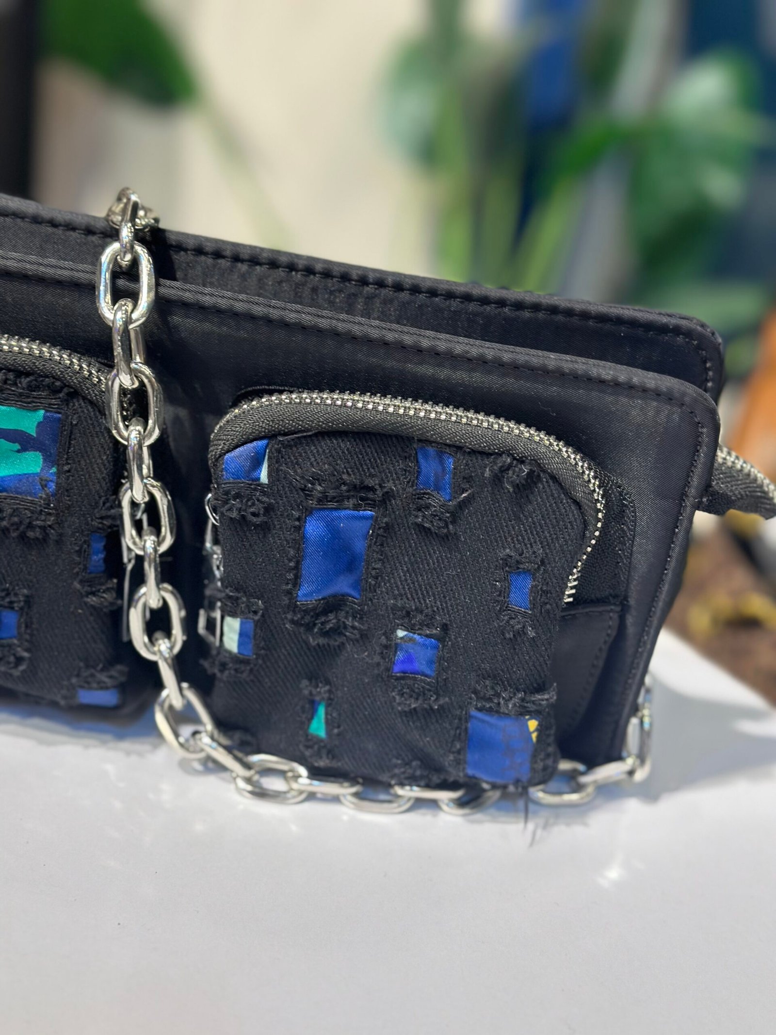 Black denim crossbody bag with small blue fabric details , modern and unique design that adds a stylish touch to any casual look.size 13*25